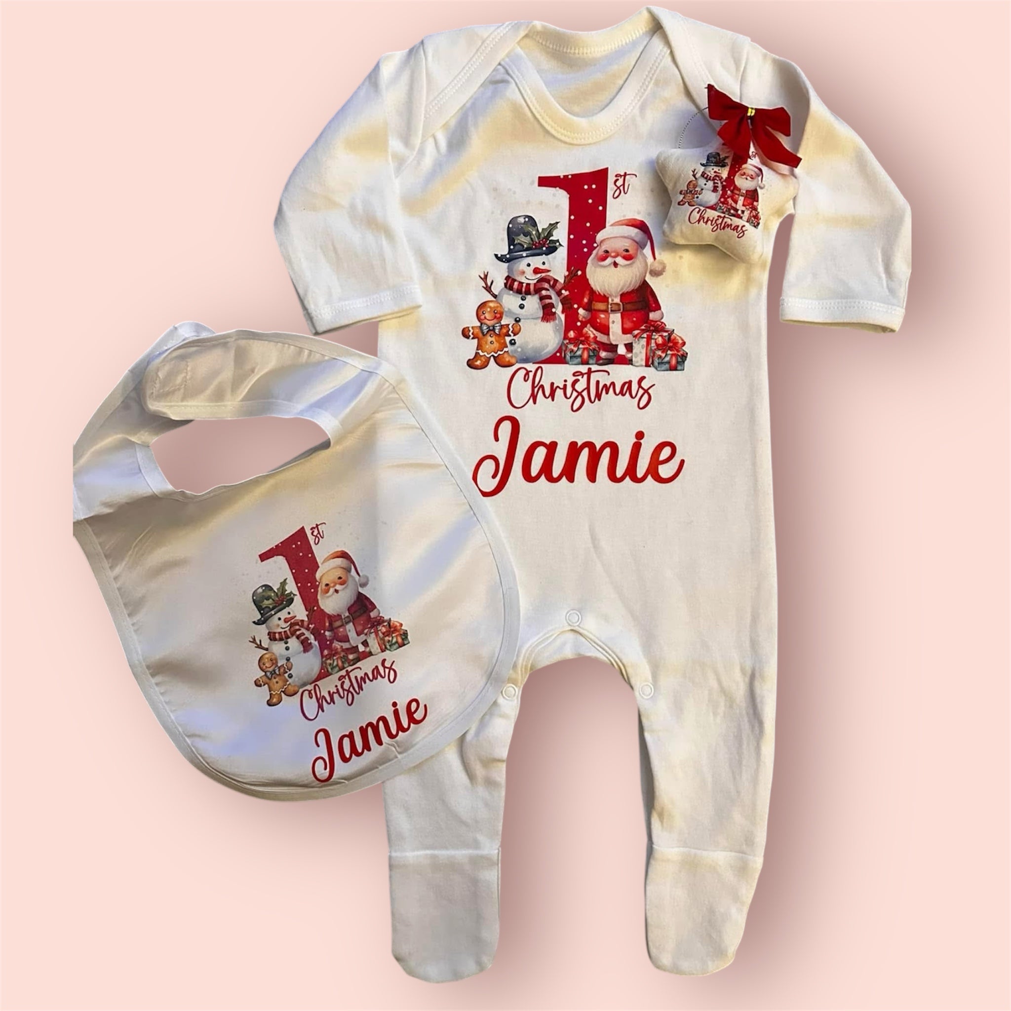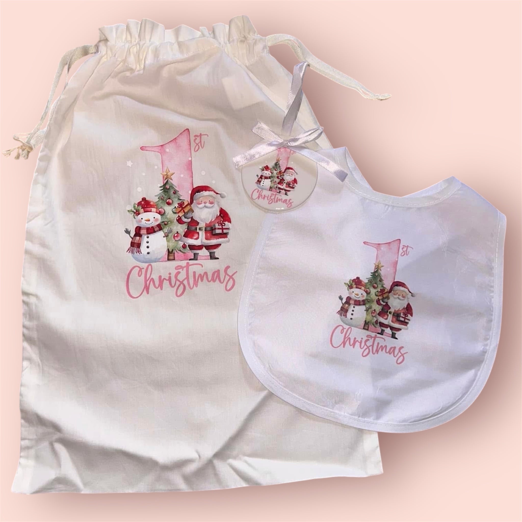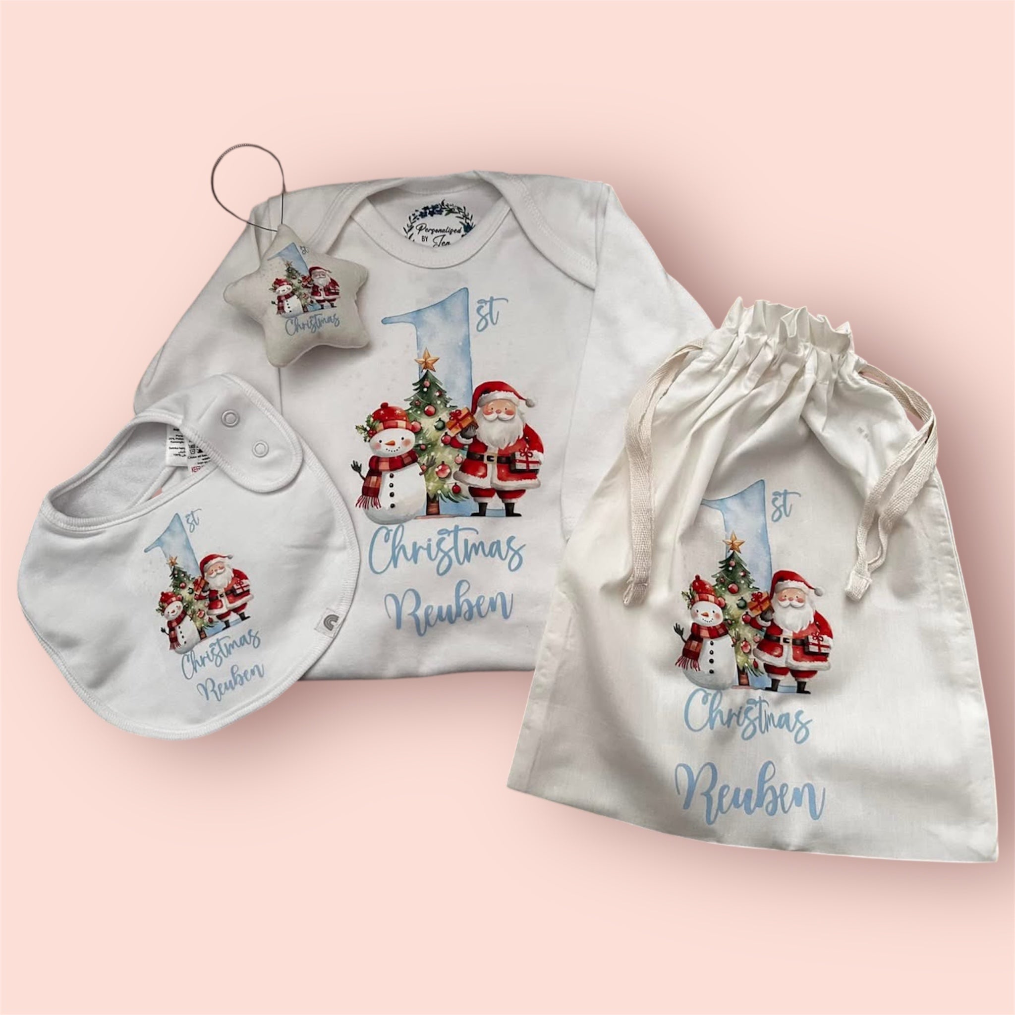 Beautiful 1st Christmas gift sets includes: Sack, sleepsuit, christmas decoration* and bib All items will be personalised with a name -...